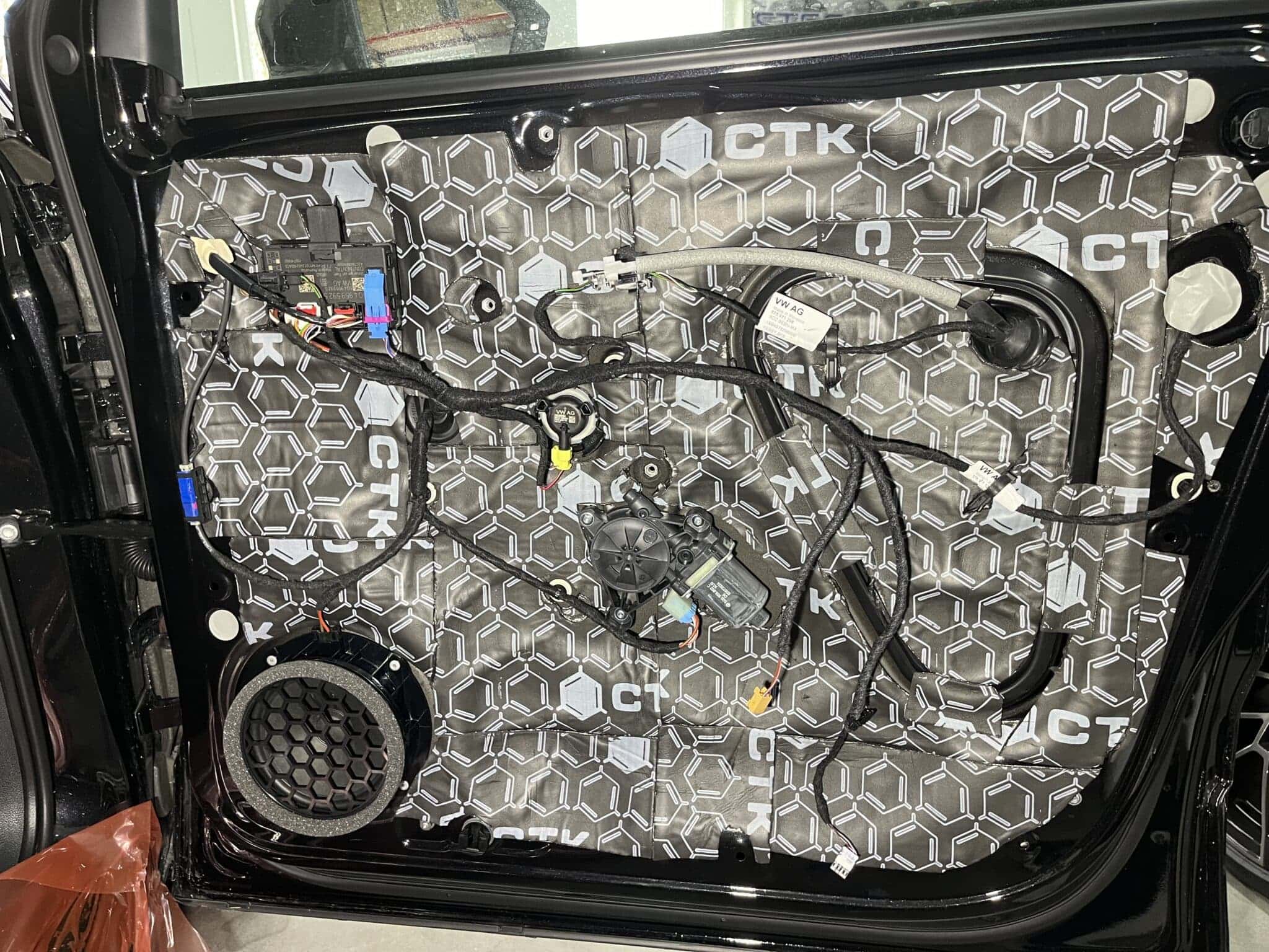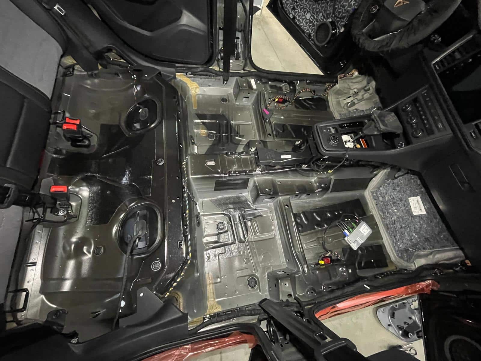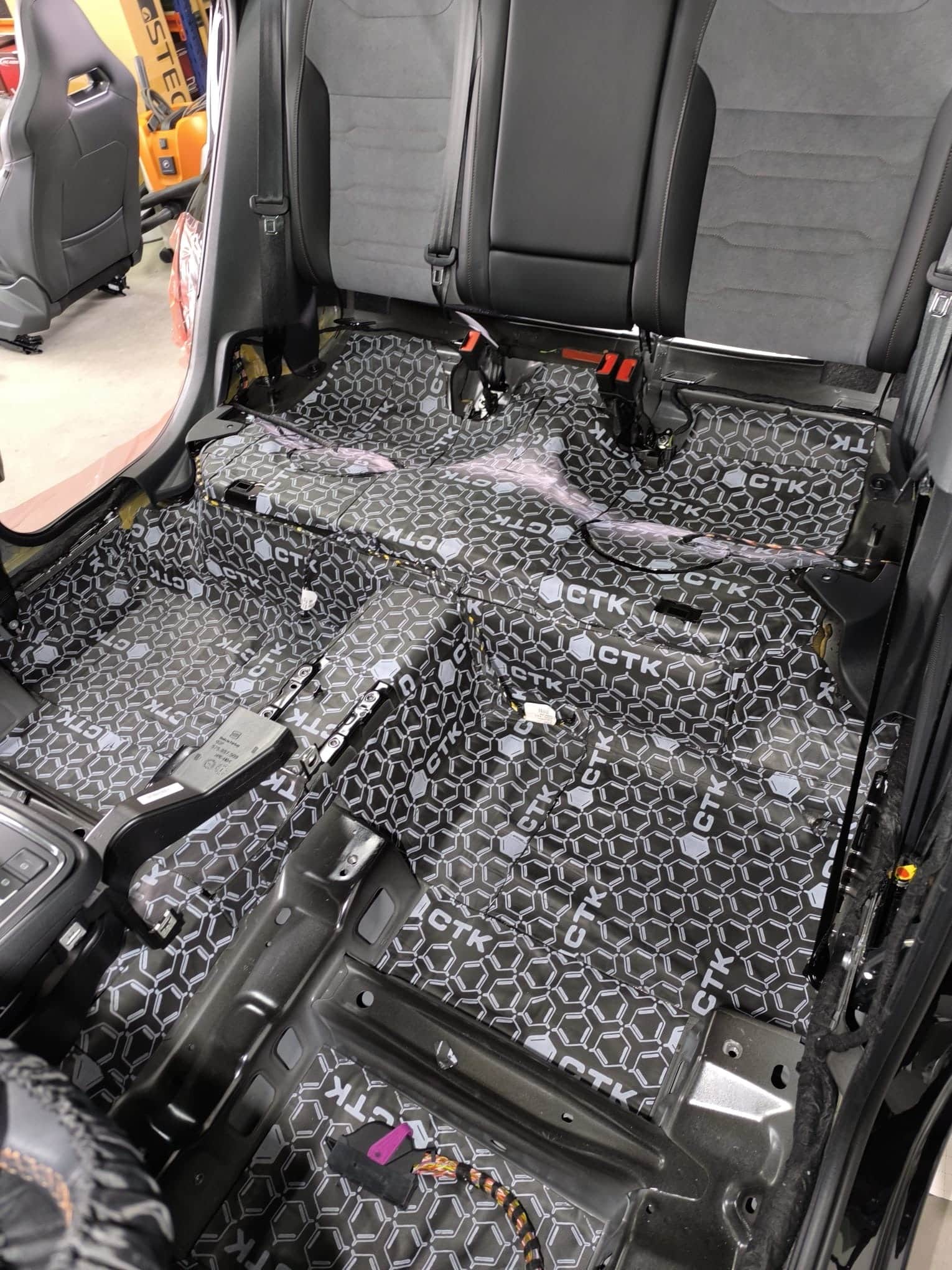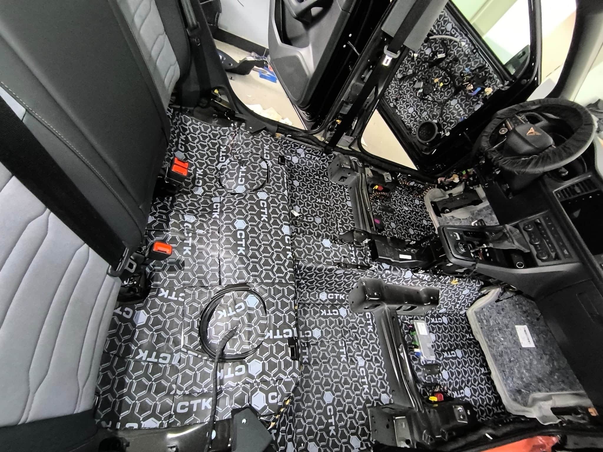 W Cupra Ateca wykonaliśmy – pełne wyciszenie auta. Drzwi, podłoga, bagażnik, klapa, słupki, podszybie, nadkola, profile – materiały Steg + CTK